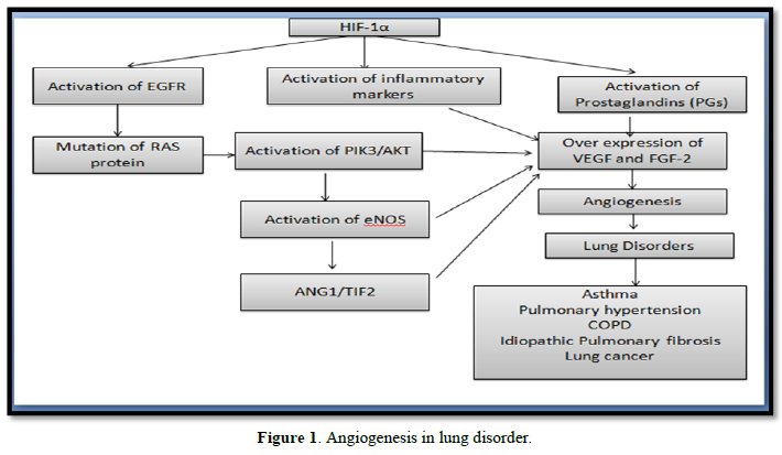 Whereas, asthma is associated with airway congestion and re-modulation because of the development of inflammation and deposition of mucus plug in respiratory tract which is linked with excessive angiogenesis [8]. Cytokines, cell adhesion molecules, growth factors, vasoactive peptides, proteolytic enzymes (metalloproteinases) and plasminogen activators play a vital role in the development of above-mentioned condition which activates EGFR/PI3K/AKT/mTOR pathways. Activation of these pathways is responsible for the activation of endothelial growth regulator followed by overexpression of VEGF and FGF-2 [3]. Lung disorders like asthma, COPD, Idiopathic pulmonary fibrosis and pulmonary hypertension develop edema, inflammation, fibrosis, airway obstruction, decrease ventilation and damage to alveolar capillaries. These conditions are responsible for the inadequate supply of oxygen to the lung tissue. If an insufficient supply of oxygen continues for a long time, supplementary mechanisms attempt to restore oxygenation or help the body adapt to hypoxia. Hypoxia is mediated by hypoxia-inducible factors (HIFs) having 2 subunits HIF-1α/2α and 1β [9]. Decreased oxygen supply after a period stabilizes HIF-1α through post-translational modification. Once it stabilizes, α subunit is cleaved off and binds to the β subunit this hetero dimer then binds to numerous promoters containing hypoxia response elements (HREs), leading to the transcription target genes of VEGF. Hypoxia-inducible factor (HIF-1) activates epidermal growth factor (EGF) which causes over expression of VEGF in lung tissue. Nitric oxide synthesis is regulated by the enzyme NO synthase specially eNOS/NOS3 isoform. This isoform plays a key role in VEGF-induced angiogenesis which is obtained by phosphorylation of eNOS isoform at serine 1117 residue by AKT or by hypoxia [10]. Uncontrolled inflammation is the main factor behind the pathogenesis of various lung disorders. Inflammation leads to alterations in the bronchial epithelium and lung micro environment [11].