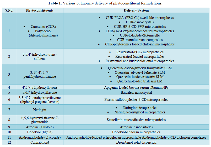 It is an appealing to think of inhalation therapy as a novel approach for drug delivery. Main focus of scientists is trying to utilize this non-invasive therapy to treat various extrapulmonary diseases also. Lung, is persistently exposed to an environment rich in oxygen and thus prone to injury caused by oxidative stress. So as to impede lung tissue damage, lung is endowed with various antioxidant protections such as glutathione, superoxide dismutase, β-carotene, vitamins C and E, uric acid and heme-oxygenase. phytoconstituents such as flavonoids i.e., polyphenolic compounds are natural Antioxidant. anti-inflammatory and antibacterial activities of polyphenolic compounds are documented, antioxidant and anti-inflammatory compound in lung tissue distributing aerosol directly to airways by a nebulizer, a pressurized metered dose inhaler (pMDI), soft mist inhaler (SMI) or a dry powder inhaler (DPI)are used. DPIs can enhance phytoconstituent physicochemical and biopharmaceutical properties and can guarantee a delivery of higher drug concentration at the deposition site [1] (Table 1).