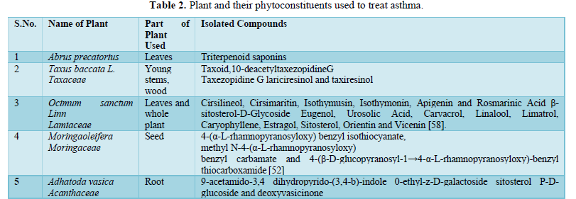 - Sangilimuthu A, Sathishkumar R, Priyadarsini DT, Anitha J, Subban R (2015) A review on phytoconstituents against asthma. Int J Pharm Sci Rev Res 30(2): 7-16.