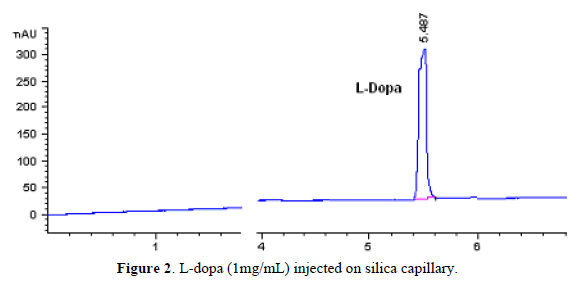 Tesoro [6] made an overview of methods to extract and analyze L-Dopa, including an electrophoresis capillary method; however the measurements are done in conditions that extract this analyte since plant matrice.