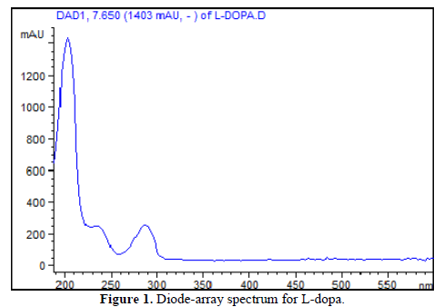 The maximum absorption of L-dopa is about 200nm, although this wavelength has more possibility of interferences from serum peptides, small protein, or other unknown compounds. The Figure 1 shows the L-dopa spectra, with no spectral features in the visible region, but with two others peaks at 236 and 285nm that can be used during analysis to decrease the interfering possibility.