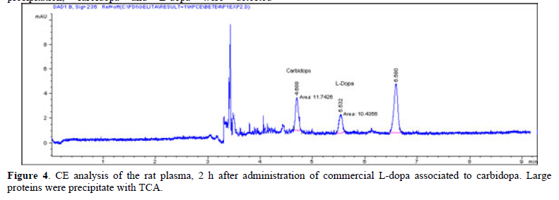 Figure 4 show a rat plasma CE profile after protein precipitation, carbidopa and L-dopa were detected separately. The L-dopa spectrum obtained was consistent with the previously found after standard injection (Figure 1). The L-dopa plasma concentration average was 5.44±0.37mg/mL.