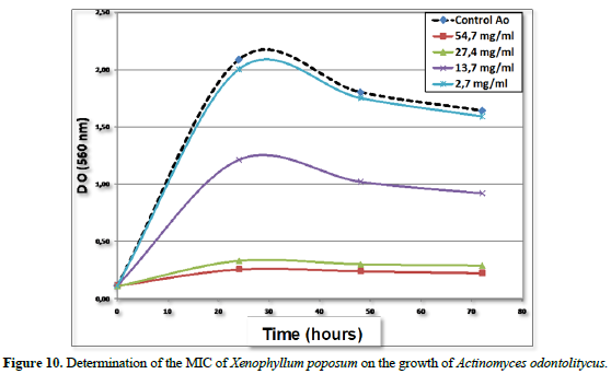 Under the conditions of this assay, significant inhibition of the development of A. odontolyticus was achieved with concentrations of 13.7 mg/ml of the ethanolic extract of X. poposum (p=0.037). With the concentration of 2.7 mg/ml the microorganism showed a behavior similar to the control in terms of optical density 560 nm; while the concentrations of 27.4 and 54.7 mg/ml did not allow the increase of the turbidity of the culture. As clearly observed in the graph, the growth curve of this microorganism remains at levels close to 0.18, which corresponds to the optical density value of the freshly inoculated tubes (Figure 10).