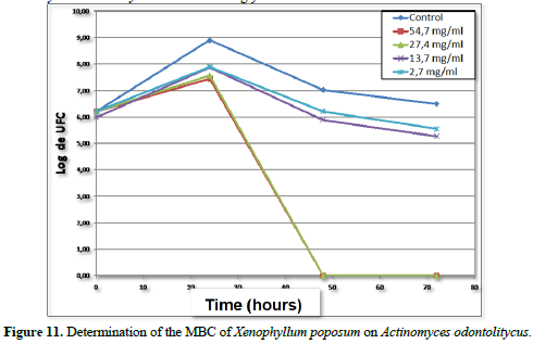 As can be seen in Figure 11, at 24 h of incubation, with all concentrations of X. poposum the number of CFU remained practically unchanged; there was a sharp decrease in the number of CFU at 48 h with the concentrations of 27.4 and 54.7 mg/ml. The MBC of the ethanolic extract of X. poposum for Actinomyces odontolitycus was accordingly 27.4 mg/ml at 48 h (p=0.026). At lower concentrations, no significant changes in the number of CFU were obtained; this situation is reflected in the graph and was also observed in the statistical analysis, since at 72 h the number of CFU did not differ too much from the control.