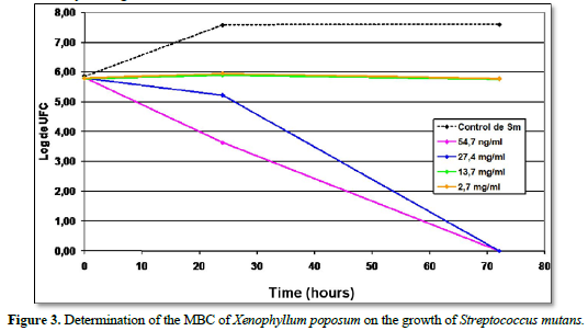 The lowest concentration of the ethanolic extract of Xenophyllum poposum capable of killing Streptococcus mutans was 27.4 mg/ml (p=0.024). For lower concentrations no statistically, significant differences were found under the conditions of this assay. In Figure 3 we can see that with concentrations of 2.7 and 13.7 mg/ml, although lower CFU counts than the control is obtained, there is no considerable drop in the counts, even at 72hs. With higher concentrations, after 72 h, no viable microorganisms are observed.