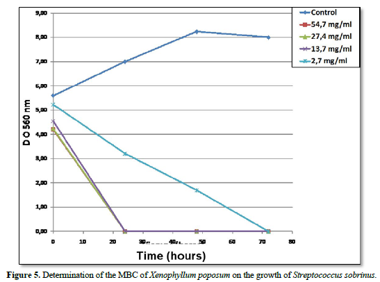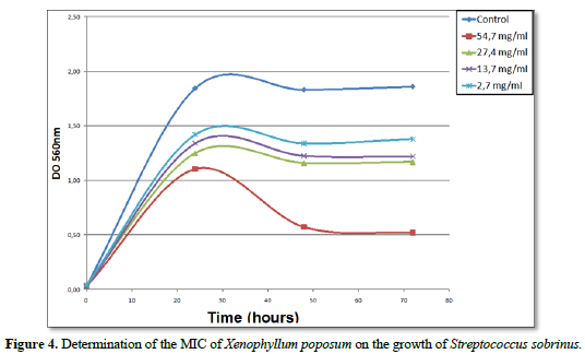 In this work we used the determination of the MIC by the dilution method since it allows us, by means of OD readings, to have information on the growth curve of the microorganism in the presence of the inhibitory substance, to compare them statistically with the controls and to carry out sowings in agar of the tubes that are kept perfectly sterile, to determine the Minimum Bactericidal Concentration. With microplates there is a greater risk of contamination for subsequent studies. The determination of MIC by the dilution method coincides with the work done by Pieri [21] where the inhibitory activity of copaiba oil (Copaifera officinalis) against Streptococcus mutans was evaluated by serial dilution in broth. They also found good inhibitory action by Copaifera on S. mutans [21] as well as the activity of X. poposum found in this work.