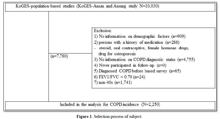 The Korean Genome and Epidemiology Study (KoGES) of the National Institute of Health at the Korea Disease Control and Prevention Agency is the largest cohort study in Korea to identify risk factors for chronic diseases common to Koreans. It establishes scientific guidelines for preventing chronic diseases. KoGES' community-based cohort was conducted in Ansan and Anseong on a two-year basis, starting with the 2001 base survey. Ansan-si is a rural area with a combination of industrial complexes, commercial areas and small-scale agriculture. The age and gender demographics within Ansan-si were evenly distributed with low population movement. KoGES' community-based cohort data, constructed through this process and used for analysis in this study. Since the data was reliable therefore it can be representative of Korea. In this study, since the results of the lung function test confirmed whether there was a residue of chronic obstructive pulmonary disease (COPD), it was analyzed using the 6th follow-up data, excluding the 7th and 8th follow-up data that were not investigated. This is because survey results of PFT were not included.