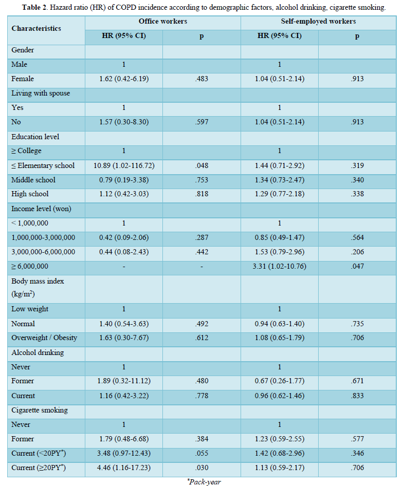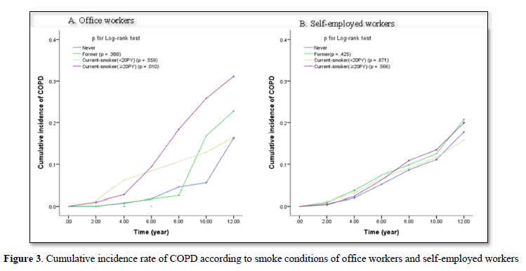 Results: The education levels and smoking status of office workers affected the occurrence of COPD. On the other hand, the income level of self-employed workers affected the occurrence of COPD and the smoking status did not. There was a difference in smoking status between office workers and self-employed workers. There was also a difference in the proportional risk of COPD according to the smoking status of office workers. There were more cases where office workers were currently smoking than self-employed workers, and there were differences in COPD incidence by smoking status. Unlike non-smoking and past smoking status, COPD incidence continued to increase from the start of observation.