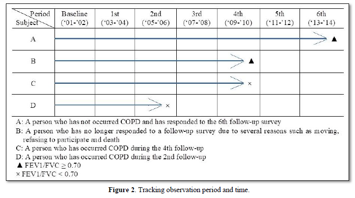 In this study, the dependent variable is the occurrence of chronic obstructive pulmonary disease. For the occurrence of chronic obstructive pulmonary disease, the time when the ratio of FEV1 to FVC was measured to be less than 70% based on lung function test results was the time when the disease occurred. The period until chronic obstructive pulmonary disease occurred was the period when the ratio of FEV1 to FVC was less than 70%, subtracting the base investigation time from the first measured survey time.