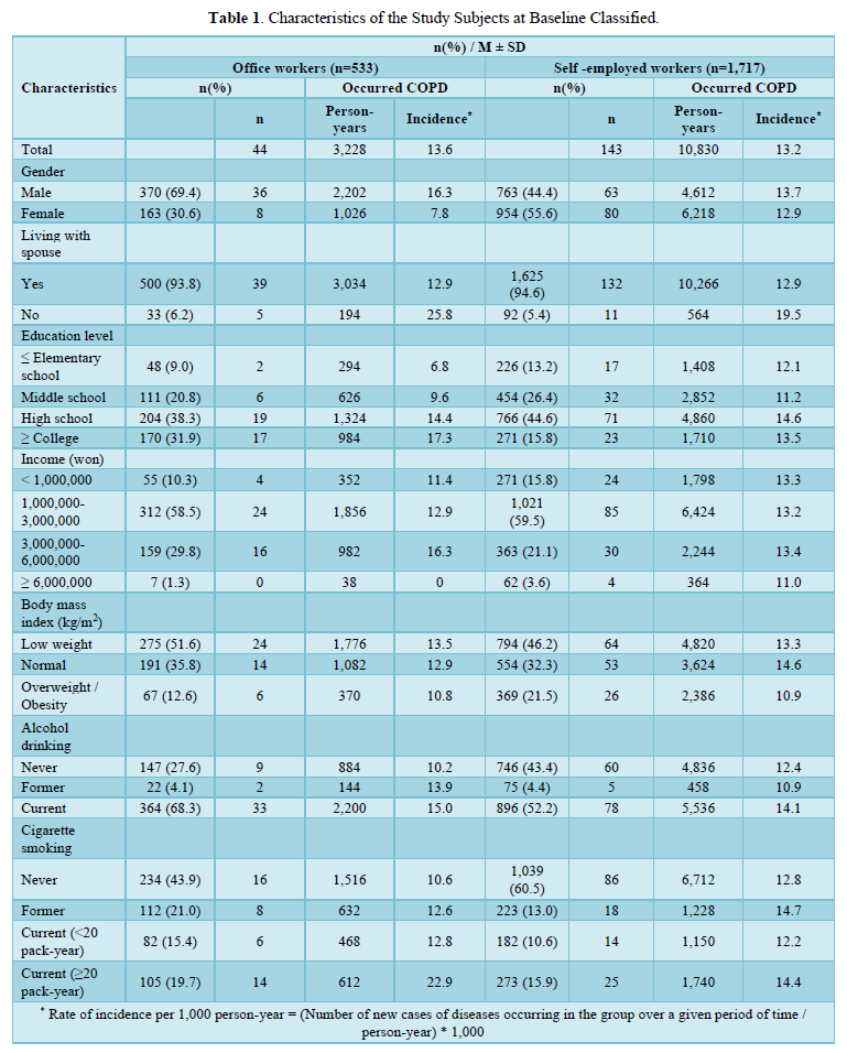 As a result of the data analysis, out of 2,250 adults in their 40s, 533 were office workers and 1,717 were self-employed. Among office workers and self-employed workers who had COPD were 44 and 143 respectively. As for office workers, 69.4% were men and 30.6% were women with 93.8% having a spouse. Education levels below elementary school, middle school and above high school were 9.0%, 20.8% and 38.3% respectively. Monthly income below 1 million won was 10.3%, 58.5% above 1 million won, 29.8% above 3 million won and 1.3% above 6 million won. The body mass index was 51.6% for those with low weight, 35.8% for those with normal weight and 12.6% for overweight and obesity. Non-drinking was 27.6% for non-drinking, 4.1% for past drinking, 68.3% for current drinking, 43.9% for non-smoking, 21.0% for past smoking, 15.4% for under 20 packs of current smoking, and 19.7% for over 20 packs of current smoking (Table 1).