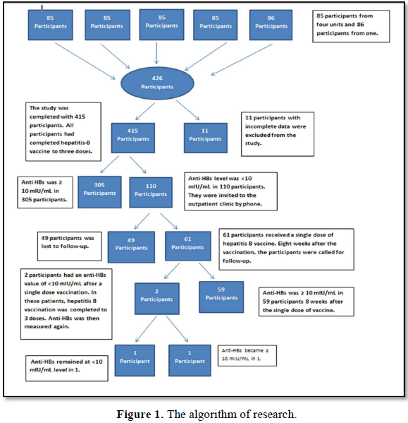 Methods: A total of 2,500 children aged between 4-10 years registered in five units of the XXXXXX Family Health Center constituted the universe of the study. Patient records from December 2014 to May 2017 were retrospectively scanned. Hepatitis B markers of children were studied from the health records and those who met the criteria were invited to the outpatient clinic through a phone call, and verbal and written consents were obtained from their parents. Participants were randomly selected (N=415). The sociodemographic characteristics, general health status, anti-HBs and HBsAg results of the participants were obtained from the health records.