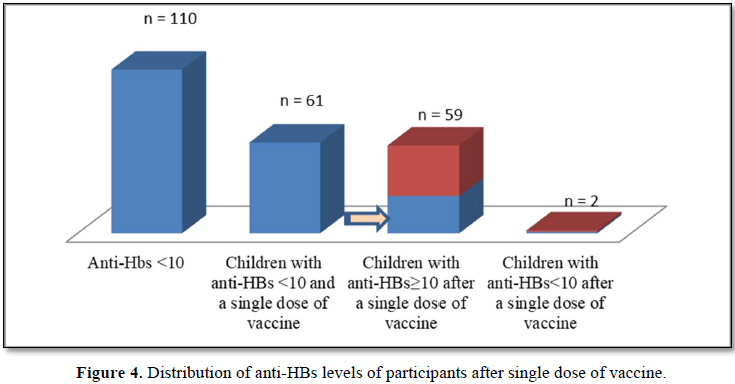 One hundred and ten patients with an anti-HBs level of 10 mIU/mL, while the anti-Hbs levels of two children (3.28%) did not (p=0.000) (Figure 4).