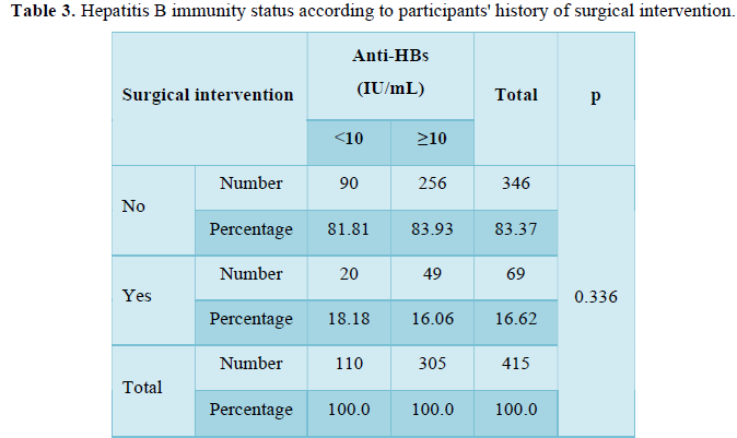 Of the participants, 26.5% (n=110) had insufficient level of anti-HBs (
