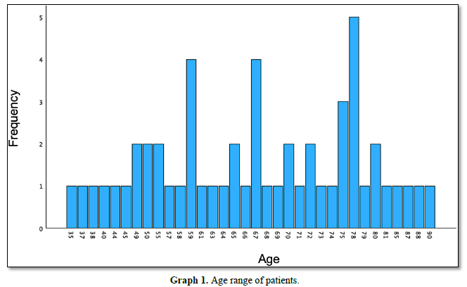 A researcher, independent of the hospital and the specialty, analyzed the database obtained from flexible bronchoscopy reports and patient records and performed statistical analysis using SPSS (IBM SPSS Version 27). Patient demographic data, age, (Graphic 1) gender, medical history, indications for bronchoscopy, and procedural details were collected (Table 1). Pre- and post-procedure vital signs, type of sedation and analgesia, whether any type of neuromonitoring was used, complications, type of previous imaging study, radiological results, sample collection, etc. were recorded. In addition, the type and brand of bronchoscope, and size of endotracheal tube in intubated patients were documented. The protocol established a safety margin of at least 2 mm between the internal diameter of the endotracheal tube and the external diameter of the bronchoscope in intubated patients. A thorough analysis of the indications for bronchoscopy, sedation and analgesia strategies, and potential risks was performed by the bronchoscopy team in all patients. The critical bronchoscopy teams consisted of four final-year emergency department residents who had previously completed the first three phases of training and were trained to perform various roles within the team (primary bronchoscopist, bronchoscopist's assistant, patient monitoring - patient stabilization physician, and general assistant), as well as an assigned physician and/or supervision of the head of the service. In all procedures, sedation and analgesia were provided by team members.