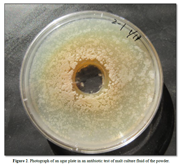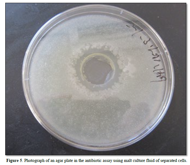 Figure 5 shows a photograph of an agar plate in the antibiotic assay using malt culture fluid of separated cells in Figure 4 a clear zone was observed.
