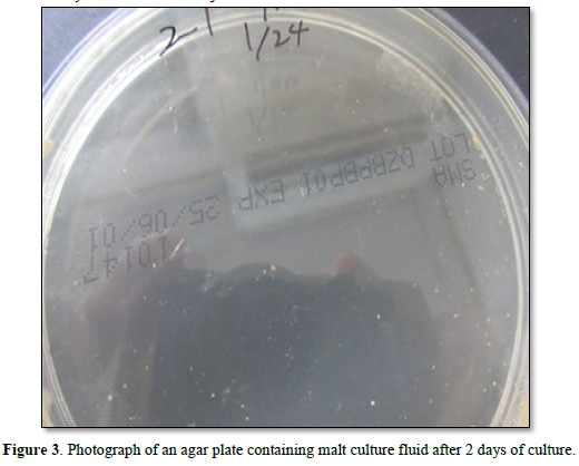 Figure 3 shows a photograph of an agar plate containing malt culture fluid after 2 days of culture. No objects were visible to the naked eye on the Petri dish.