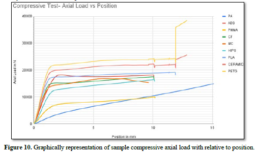 In this experimental study, graph was drawn from the excel data of nine different filaments, namely ABS, PLA, PETG, PMMA, PA, HIPS, ceramic, carbon fiber, and metal composite. The experimental results were graphically represented, with the x-axis denoting distance by which specimen is expanded which is also position change from rest position in mm and the y-axis representing the applied axial load in newtons (Figure 7). Notably, the analysis revealed varying breaking times among the tested filaments, demonstrating their diverse mechanical behaviors under tensile stress. Polyamide (PA) exhibited a noteworthy characteristic, as it required an extended duration before experiencing failure, more than 50mm of elongation, signifying its superior resistance to tensile forces. Conversely, the metal composite filament displayed the shortest breaking time at an elongation of 1.6mm from zero position, suggesting its comparatively reduced tensile strength (Figure 7). These findings contribute valuable insights into the mechanical properties of different filaments, offering valuable information for applications in various fields such as manufacturing, engineering, and material science. As travel speed was constant throughout the testing process, the distance travel is directly proportional to the time taken to break the specimen. The breaking time of the filaments is shown below:
