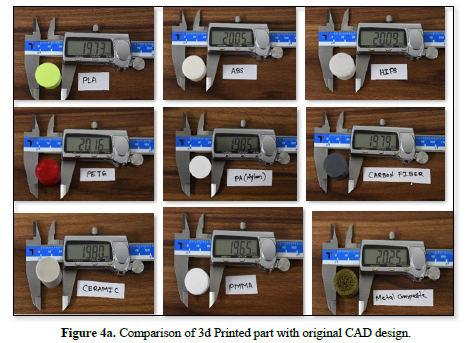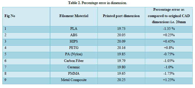 Figure 4a comprises nine images illustrating discrepancies in dimensions compared to the CAD-designed part, with each printed component exhibiting distinct measurements. Table 2 provides a breakdown of the percentage error observed in the printed parts. Negative values indicate dimensions smaller than those of the actual CAD model, while positive values signify dimensions exceeding the original CAD dimensions. Graphically representing the percentage error, Figure 4b visually depicts the variations. The error percentage was meticulously assessed using a Vernier caliper, with the least count of 0.01mm. It is found that maximum and minimum error was of -1.75 % (PMMA) and -0.25%(ABS).