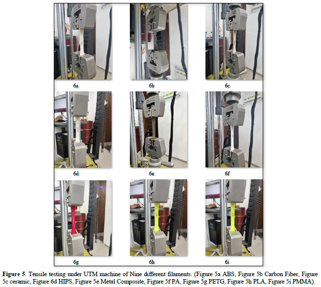 One specimen was made for each type of test, a total of 9 parts were printed for measuring tensile strength. For statistical evaluation, software office 365 excel was used. Figure 5 shows the images of nine specimen (Figure 5a ABS, Figure 5b Carbon Fiber, Figure 5c ceramic, Figure 5d HIPS, Figure 5e Metal Composite, Figure 5f PA, Figure 5g PETG, Figure 5h PLA, Figure 5i PMMA), respectively, which are clamped with holder on both ends of specimen. The specimen was then locked using allen bolt on a specimen holder. Initially at rest position the setup was taken to zero to avoid any error while calculating the values. The data was saved to the excel file. The breaking point of all the samples was different depending on the properties the filament. In each case the nine samples of filament material were subjected to the tensile tests. The tensile test results achieved for different filament material are shown in Table 3.
