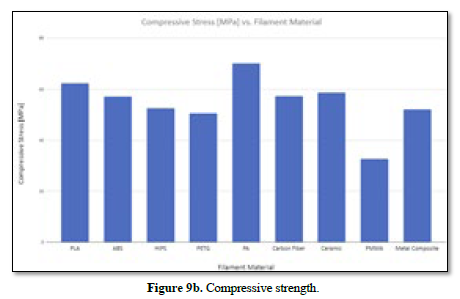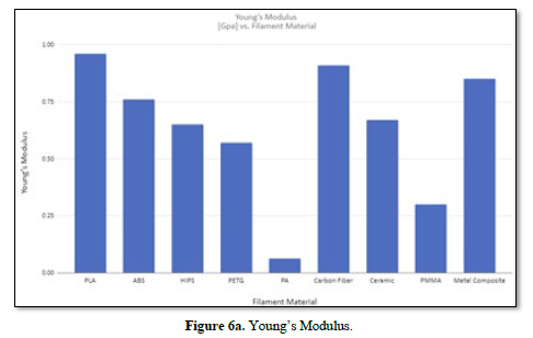 Young's Modulus aids in understanding the elasticity of materials and how materials with varying elastic properties can be applied in specific applications. In this study, the young's modulus for tensile strength of PLA is found to be maximum, while that of PA is minimum. This suggests that PLA exhibits greater stretch ability and elasticity compared to other materials. Conversely, since PA has the lowest Young's modulus, it can be utilized to fabricate strong components. Similarly, in terms of compressive strength, PLA demonstrates the maximum elasticity while PA exhibits the minimum. Consequently, PLA can undergo greater deformation under compression compared to PA and other materials. If required printing part needs to be flexible, then PA can be considered due to its greater young’s modulus value.