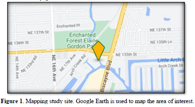 Study Site: The Enchanted Forest Elaine Gordon Park is a 22-acre (8.90 Ha) oasis of subtropical plants, trees, and animals that borders Arch Creek in the heart of North Miami (Figure 1). It offers scenic beauty, paved trails, and 2 picnic facilities that can be rented for special events and parties. There is also a private pony ride concession within the park.