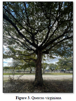 Species Composition: A total of 10 species and 278 trees were identified, with most species categorized as endemic to North America. Of all the palm trees, the Sabal Mexicana is the most abundant, with 27 trees in the park. Of all the hardwood trees, Oaks (Quercus virginiana) were the most abundant with 168 trees (Figures 3 & 4).
