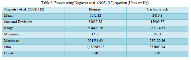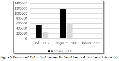 In Figure 5 and Tables 2-4, we present the Biomass and Carbon Stock for Hardwood, and Palm Trees calculated with three different equations: Brown & Iverson [11], Nogueira [12] and Donkor [13]. From this point forward, we continued using Brown & Iverson [11] which provides more conservative values, as well as Donkor [13] for Palm Trees.
