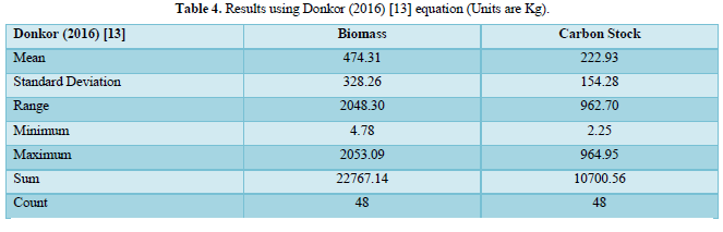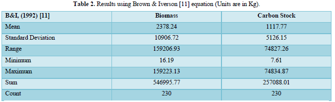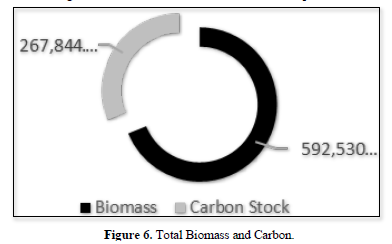 Total Biomass and Carbon Stock in our Enchanted Forest Elaine Gordon Park study are represented in Figure 6, we added the values obtained through the calculation of Biomass and Carbon with Brown and Iverson [11] equation for hardwood trees to the ones obtained for palm trees with the Donkor et al equation.