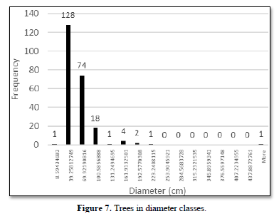 Tree diameters broken down into categories are shown in Figure 7. We can see there that the highest number of trees belong to the 39 cm tree diameter category followed by the 70 cm tree diameter category (74 trees). As in the case of Srinivas [14], a species of Ficus turned out to be the species with the higher amount of biomass, and hence carbon captured (data not shown).