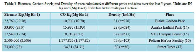 In Table 1 we compare the results of Biomass, Carbon, and Density of Trees in various sites studied over the last 5 years. The highest density values were obtained at the Pelican Harbor Facility, but this could be due to the influence of tree size, which has a major effect on biomass. We observed this relationship in graphs made by Srinivas [14], and how biomass increased due to the presence of Ficus trees in some local parks.