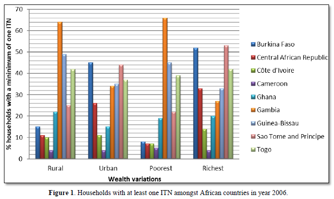 In 2006, 20% higher households with at least one ITN in Burkinafaso was observed in rich/urban than rural/poorest areas, Sao Tome and Principe and Central African Republic had similar results but at a lower level.