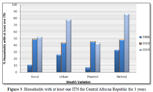 Central African Republic peaked in the year 2019 to about 70% in the rich /urban zones compared to other years. Though in 2006 less than 15% households had at least one ITN in the poorest/rural areas (Figure 3), over 30% increase was observed as the year progressed. Though increase in households with ITN with year progression was more in urban/ rich zones of the country.