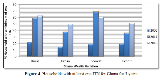 Across 29 countries in sub-Saharan Africa between 2011 and 2016 the median (range) of the percentage of households with enough ITNs was 30.7% (8.5-62.0%). The use of ITN was observed to increase at ages 0-4 years and 30-40 years. It concluded that having sufficient ITNs in the household increases rate of utilization and reduces existing disparities between age and gender groups [3].