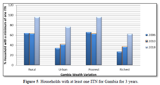 As observed in the figure below (Figure 1) Cameroon had the lowest percentage of households with a minimum of one ITN in 2006 across wealth variables. Same year Gambia had the highest household owning ITN at a level of over 60% but this was majorly in the rural and poor areas. All other countries had less than 55% households with a minimum of one ITN. Though at a lower level Guinea Bissau showed more households with ITN in the rural/poorest than rich/urban areas.