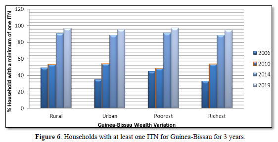 Guinea Bissau also had the highest percentage of households with at least one ITN in the most recent years almost at a100% irrespective of wealth variation, depicting that at present whether poor or rich, living in rural or urban zones almost every household own at least one ITN in Guinea Bissau. In line with this study, a 2020 study reported that every household in Guinea Bissau contained nets [12]. Though the usage rates and state of the long-lasting insecticide-treated net (LLIN), was beyond the scope of this present study. Hutchins et al 2020, reported that 23.0% of households had a minimum of one expired net, 89.0% of households also reported that all residents used nets. The communities were also reported to have good knowledge of malaria; however, it was also stated the persistence of malaria despite the high ownerships of LLINs observed in their research suggests the importance of novel supplementary approaches [12].