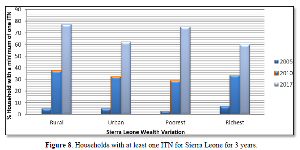 Over three million long-lasting insecticide-treated nets (LLINs) were distributed in 2010, at Sierra Leone. It was aimed at providing protection from malaria to individuals in all households in the country. In households owning ≥1 ITN, 76.5% slept under an ITN the night preceding the survey [9].
