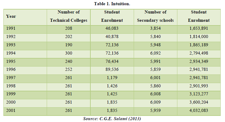 According to C.G.E. Salami (2013) the Nigerian Living Standard Survey (NLSS, 2006) estimated the poverty Enrolment in Secondary and Vocational/Technical Institutions (1991-2001) the collapse of the world economy since 2008 are considered. Although more vocational skills training institutions are being constructed, (Osunde & Omoruyi, 2004). highlight that government efforts to promote skill acquisition through the development of these institutions have not produced the expected impact. For some of the aforementioned reasons, young people are not motivated to take advantage of opportunities linked with vocational education, despite the establishment of more vocational training institutes. The pattern of student enrolment in secondary and vocational schools reveals that while there have been more technical/vocational colleges since 1991, the number of enrolled students has been falling since 1997. In contrast, enrolment in secondary schools has increased during the same period (Table 2).