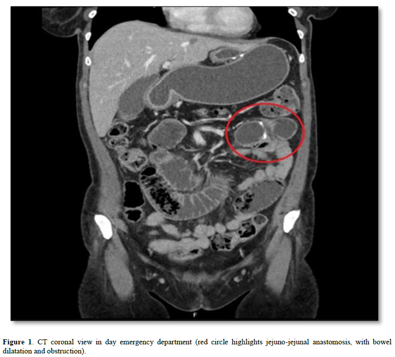 A 57-year caucasian female patient, with an admission BMI (Body mass index) of 36.7 kg/mm2 with arterial hypertension and obstructive sleep apnea (using Continuous Positive Airway Pressure device - CPAP) underwent LRYGB in November 2022. Seven months after surgery the patient was admitted to the Emergency Department with bouts of vomiting evolving over 1 week, followed by sudden and intense abdominal pain in the past 24 h. The pain was epigastric with dorsal radiation, associated with copious vomiting. There was no fever or gastrointestinal transit alterations. Analytically, there was no leukocytosis or increased CRP. Arterial blood gas analysis revealed a lactate level of 2.88.