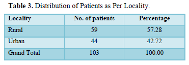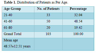 In present study, the patient population is categorized into three age groups. The largest group comprises individuals aged 41-60, with 50 patients, representing 48.54% of the total. The 21-40 age group follows, including 33 patients or 32.04% of the total. The smallest group consists of patients aged 61-80, totalling 20 individuals and accounting for 19.42% of the population. Overall, there are 103 patients, with the mean age being 48.57 years, with a standard deviation of 12.51 years (Table 1).