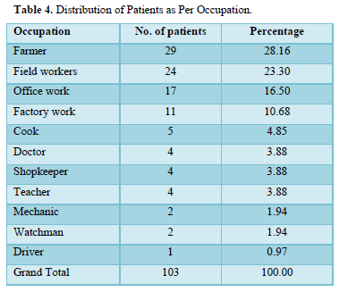 Among the 103 patients surveyed, the distribution across occupations varied. The majority of patients were farmers, with 29 individuals representing 28.16% of the total. Field workers followed closely, comprising 23.30% with 24 patients. Office workers accounted for 16.50% of the sample, totaling 17 patients. Factory workers made up 10.68%, with 11 patients. Cooks and shopkeepers each represented 4.85% and 3.88% respectively, with 5 and 4 patients respectively. Teachers also made up 3.88% of the sample, with 4 patients. Drivers and watchmen each accounted for 0.97% and 1.94%, with 1 and 2 patients respectively. Mechanics were the least represented, with only 2 patients making up 1.94% (Table 4).