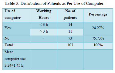 In present study among total population 25(24.27%) were using computer for daily work. While 73(75.73%) were not using computer. Mean working hours were 3.24±1.45 h (Table 5).