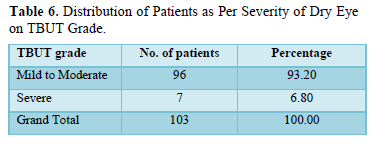 In the study, the tear break-up time (TBUT) grades were distributed as follows: 96 patients, or 93.20%, had mild to moderate TBUT grades. In contrast, 7 patients, representing 6.80%, were classified with severe TBUT grades (Table 6).