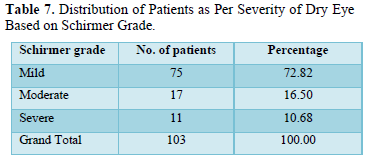 In the study, Schirmer test grades were distributed as follows: 75 patients (72.82%), were classified with mild dry eye, indicating relatively adequate tear production. A total of 17 patients, representing 16.50%, were categorized with moderate dry eye, reflecting a noticeable reduction in tear production. The remaining 11 patients, (10.68%) had severe dry eye, characterized by significantly impaired tear production (Table 7).
