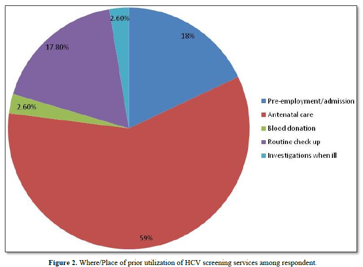 Figure 2 showed where/place of prior utilization of HCV screening services among respondent. Only 39 respondents had previously being screened for HCV out of which 59.0% were screened during antenatal care, 18.0% during pre-employment screening/admission, 17.8% during routine medical checkup, 2.6% during investigation when ill and during blood donation each.