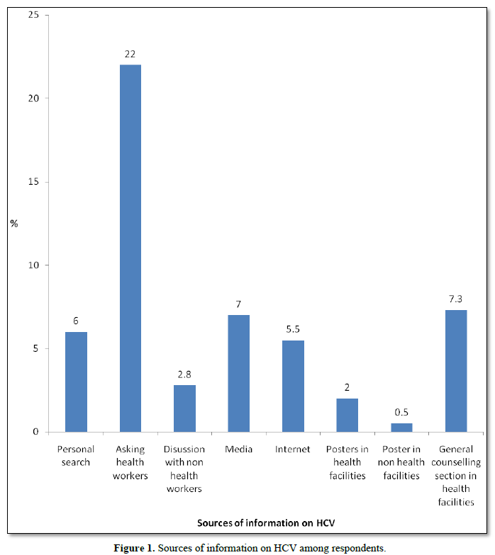 Figure 1 showed the sources of information on HCV among respondents. Almost 88(22.0%) of the respondents reported “asking health workers” as their major sources of information on HCV while others reported “general counseling in health facilities” 29 (7.3%), media 28 (7.0%), personal search 24 (6.0%), internet 22 (5.5%), “discussion with non-health workers” 11 (2.8%), posters in health facilities 8 (2.0%) and posters in non-health facilities 2 (0.5%).