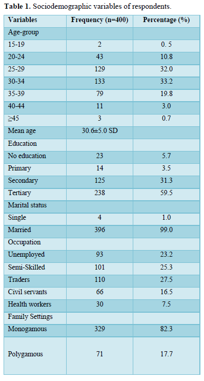 Table 1 displayed the sociodemographic characteristics of respondents. Four hundred pregnant women were involved in the study. The mean age of participants was 30.6 years and a standard deviation of ± 5.0 years. Most of the study participants 133(33.2%) were within age group 30-34, majority of them 238(59.5%) obtained tertiary education, 396(99.0%) were married, 110(27.5%) were traders and 329(82.3%) were of monogamous family setting.
