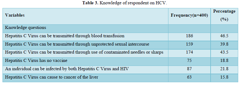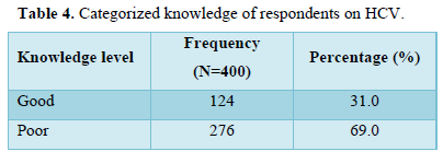 Table 4 showed respondents’ knowledge score on HCV. About 124(31%) of respondents had good knowledge while 276 (69%) had poor knowledge.