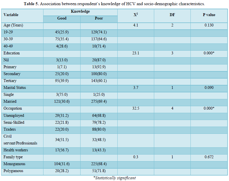 Table 5 showed association between respondent’s knowledge of HCV and their socio-demographic characteristics. Good knowledge of HCV was significantly associated with education and occupation of respondents (P=0.000).