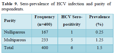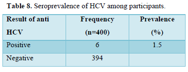 Table 8 showed seroprevalence of HCV antibodies among respondents. Six (6) of the participants were positive for HCV, indicating a seroprevalence of 1.5%.