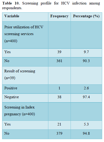 Table 10 showed that only 39 (9.7%) had previously accessed HCV screening services of which 1(2.6%) was positive for HCV antibodies. Also, only 21(5.3 %) of the study subject were screened in their index pregnancy.